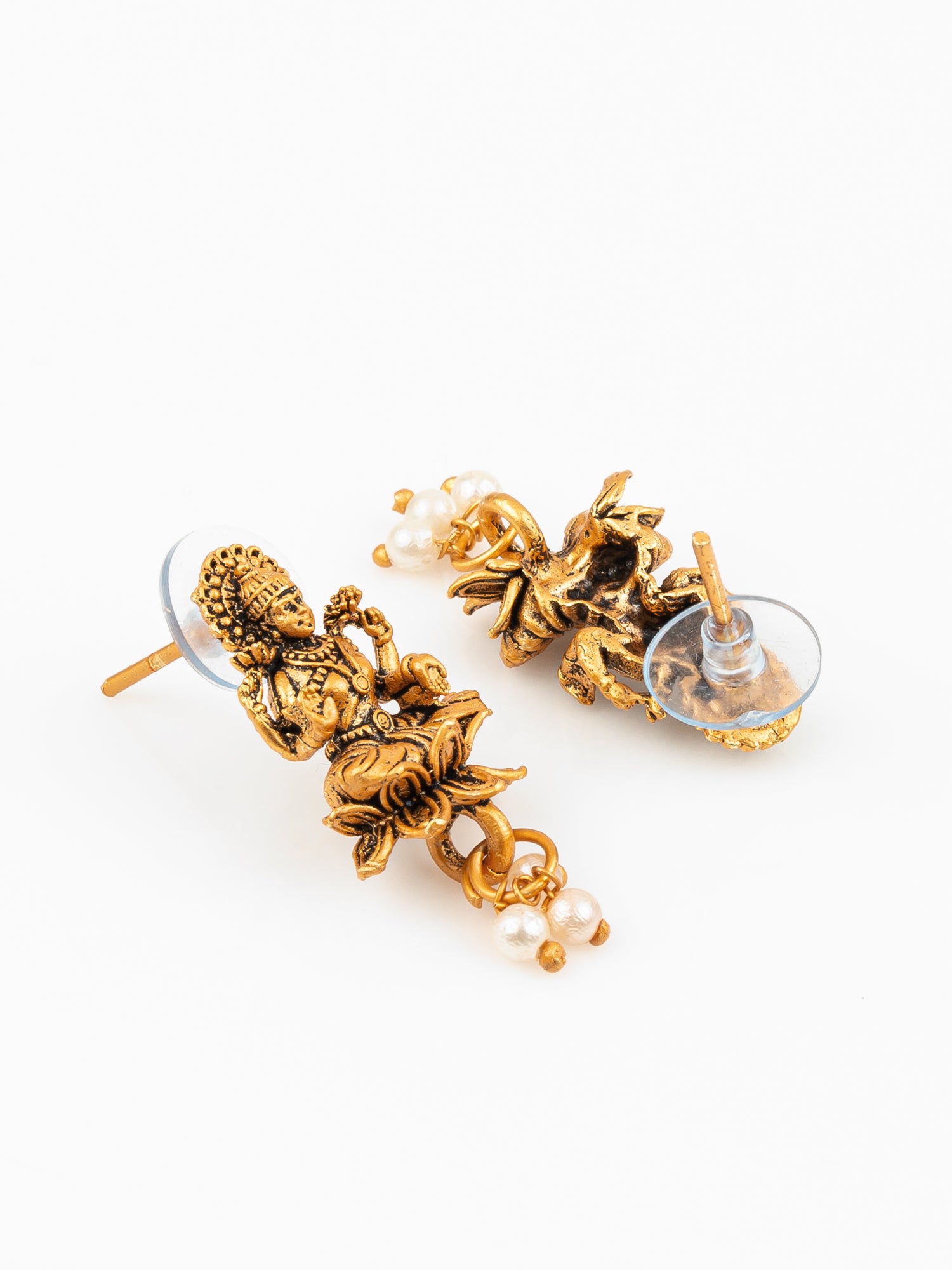 Enhance your ethnic charm with this Aadita antique temple jewelry necklace set, featuring a beautifully crafted Laxmi Devi motif in the center, adorned with multicolor stones and delicate pearl danglings. The intricately designed side pendants and earrings reflect traditional craftsmanship and cultural elegance. Perfect for religious occasions, weddings, and traditional celebrations. Designed for comfort and style, this set adds divine grace to your look.