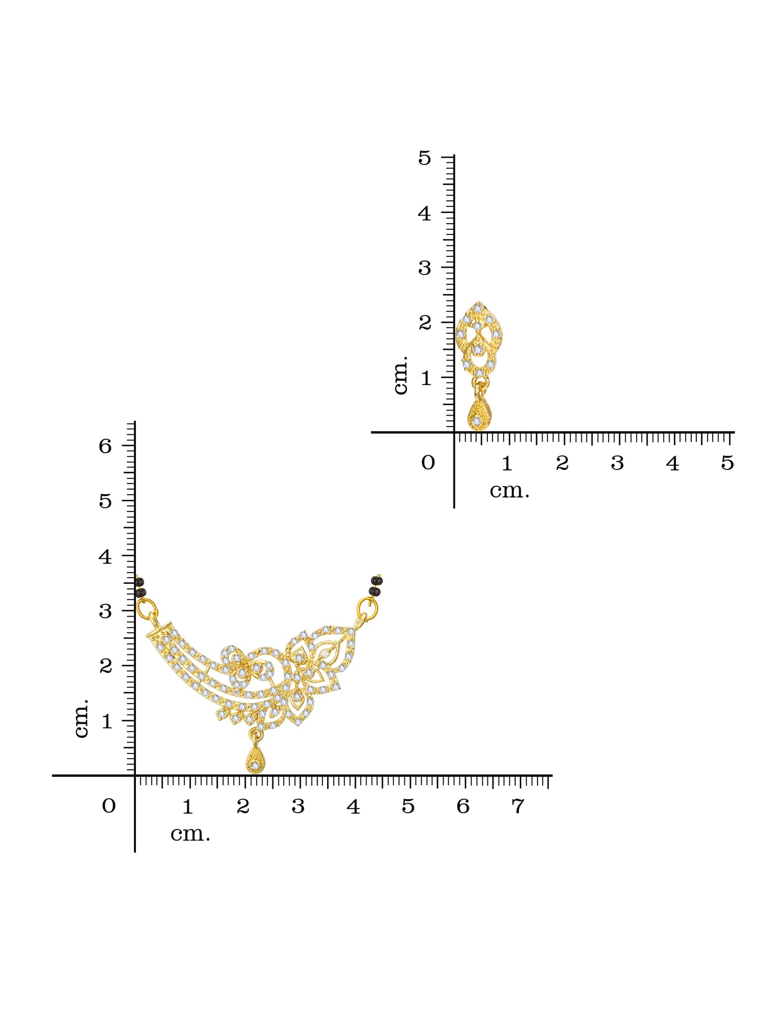 Aadita presents a beautifully crafted Mangalsutra set defined by its fluid, asymmetrical floral vine design. The pendant is heavily encrusted with high-quality white stones that catch the light with every movement, suspended from a classic single-strand black bead chain. Paired with delicate matching earrings, this set is a premium choice for festive occasions or adding a touch of sparkle to office attire.