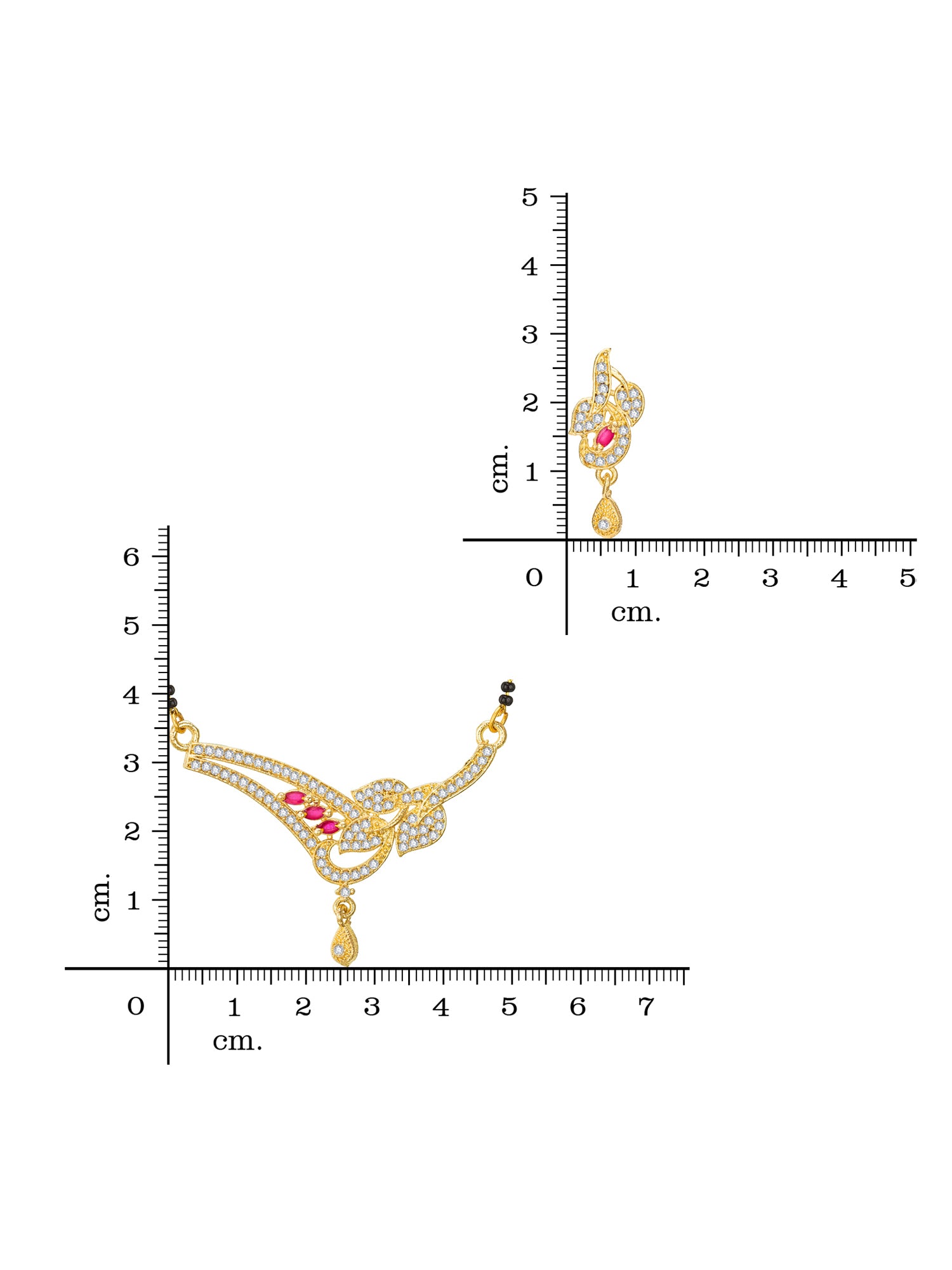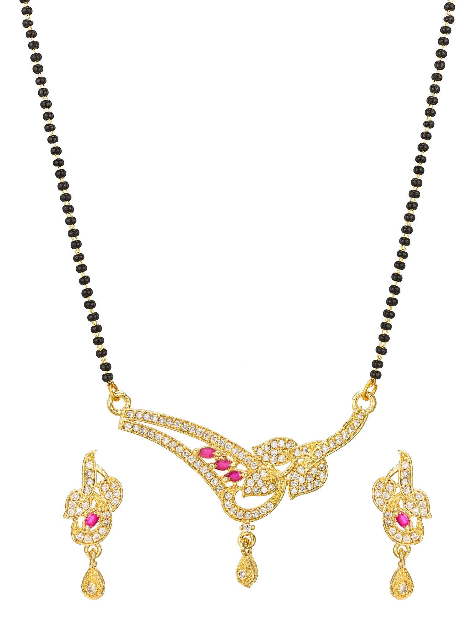 This exquisite Mangalsutra set by Aadita blends traditional symbolism with a graceful, nature-inspired aesthetic. The single-strand black bead chain supports a polished gold-plated pendant featuring a sweeping leaf motif adorned with sparkling white stones and marquise-cut pink accents. Accompanied by matching drop earrings, this set offers a sophisticated touch suitable for both daily wear and special family gatherings.