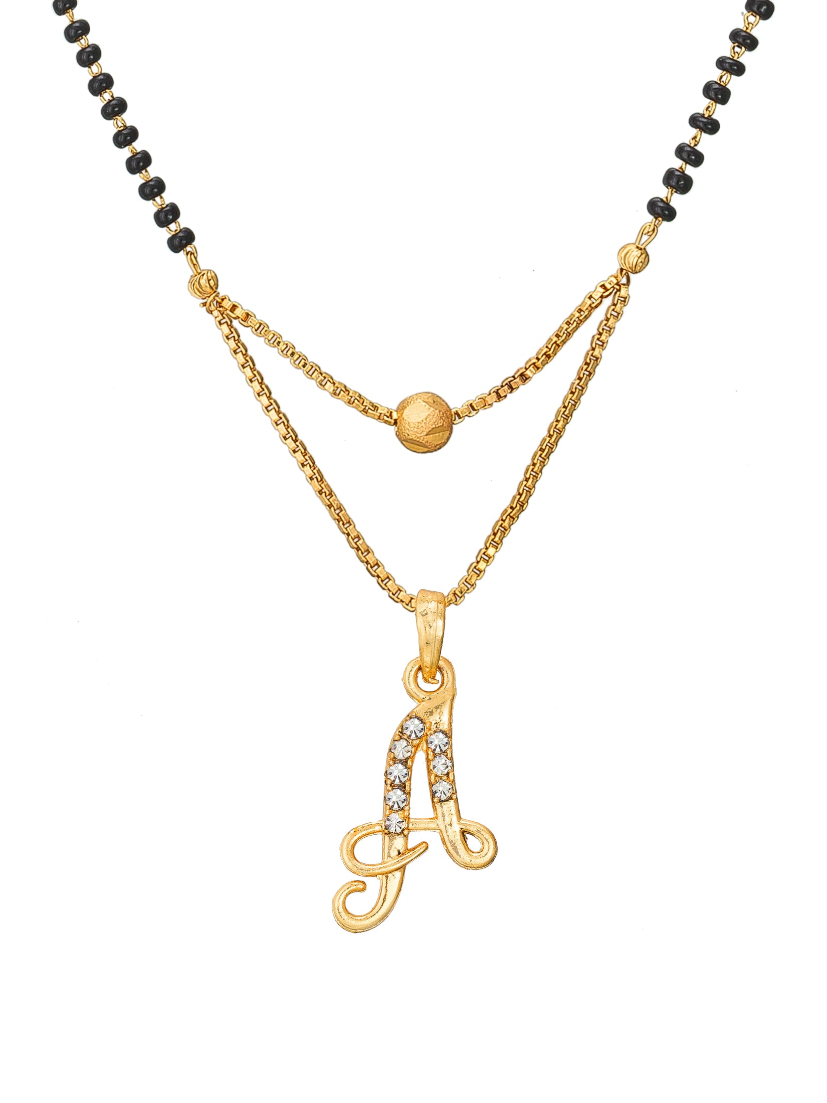Celebrate personal identity with this 'A' initial Mangalsutra by Aadita. The pendant features a cursive letter 'A' embellished with clear sparkling stones, set on a gold-tone base. The chain combines traditional black beads with a modern gold chain design, creating a perfect fusion of cultural significance and contemporary personalized fashion.