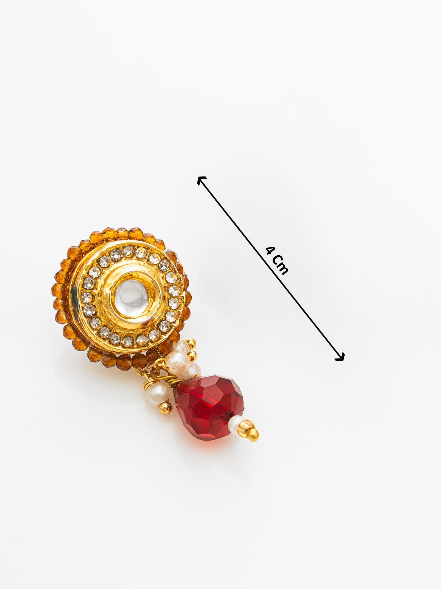 Make a regal statement with Aadita’s gold-plated Kundan necklace set featuring amber-toned beads, lustrous pearls, and a striking circular pendant. The intricate design is accented with clear Kundan stones and teardrop-shaped crystal dangles. Matching earrings complete the set, making it perfect for weddings, festivals, or any traditional celebration.