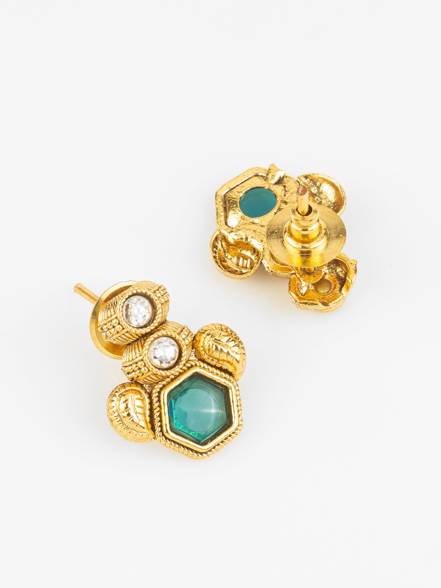 Elevate your traditional look with Aadita's gold plated designer necklace set featuring enchanting green stones. The unique hexagonal stone design adds a modern touch to its ethnic charm, making it perfect for festive and wedding occasions. Crafted with finesse and paired with stylish matching earrings, this set brings elegance to every outfit.