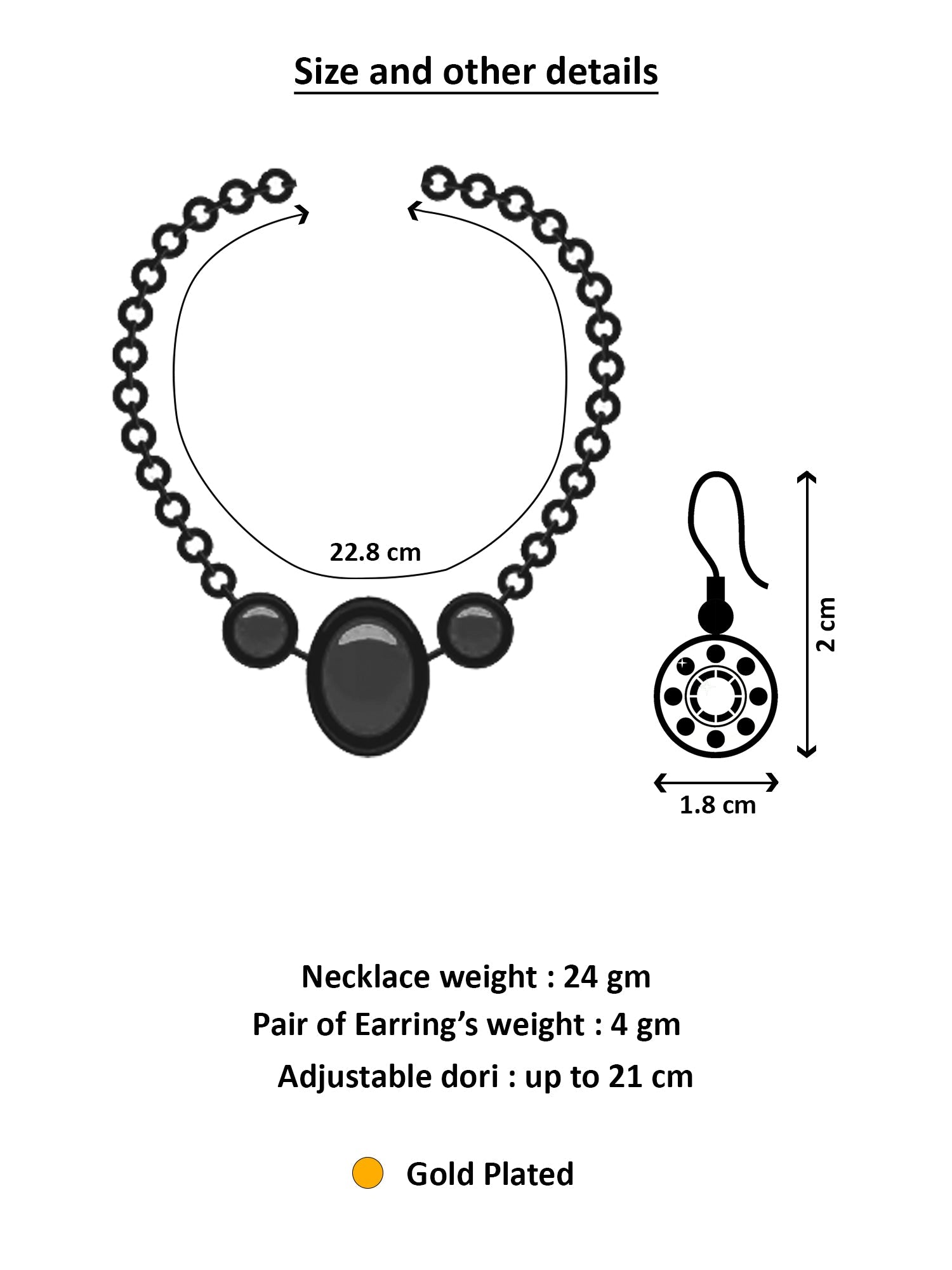 Size: Necklace Length: 22.8 cm, Earrings: 2 cm x 1.8 cm, Adjustable Dori: up to 21 cm