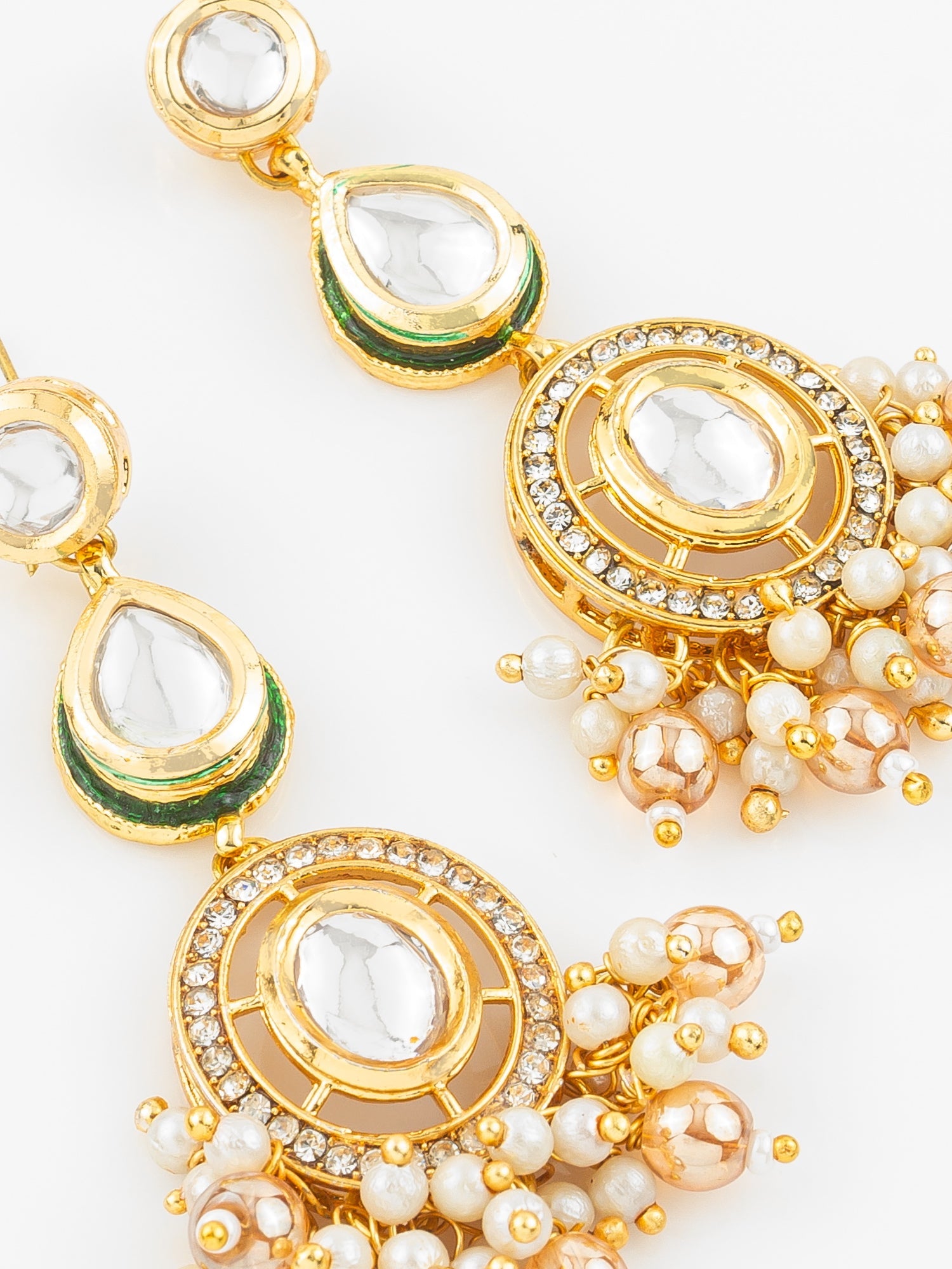 Enhance your ethnic charm with Aadita's stunning traditional gold plated earrings. Featuring an intricate kundan design paired with beaded clusters, these earrings reflect regal elegance and festive glamour. Ideal for weddings, parties, and festive occasions, the earrings bring a beautiful blend of grace and boldness. Their versatile gold and white tones complement a variety of Indian outfits, from sarees to lehengas. Let Aadita redefine your traditional jewelry collection.