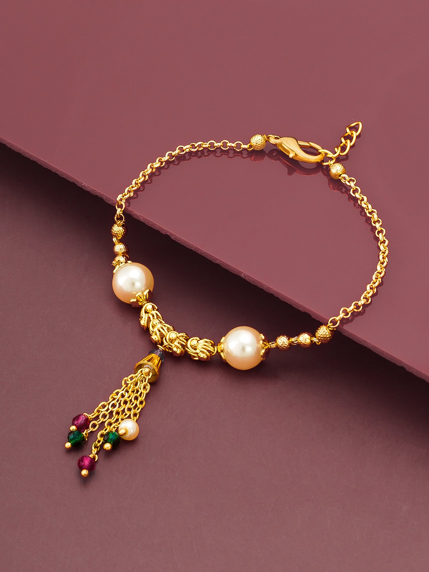 Add a vibrant touch to your jewelry box with this exquisite Aadita chain bracelet. Beautiful white pearls are set along a classic gold-plated chain, highlighted by an eye-catching tassel drop adorned with festive red and green beads. This traditional yet premium piece captures attention instantly, making it a highly desirable accessory for weddings, cultural events, or special celebrations.