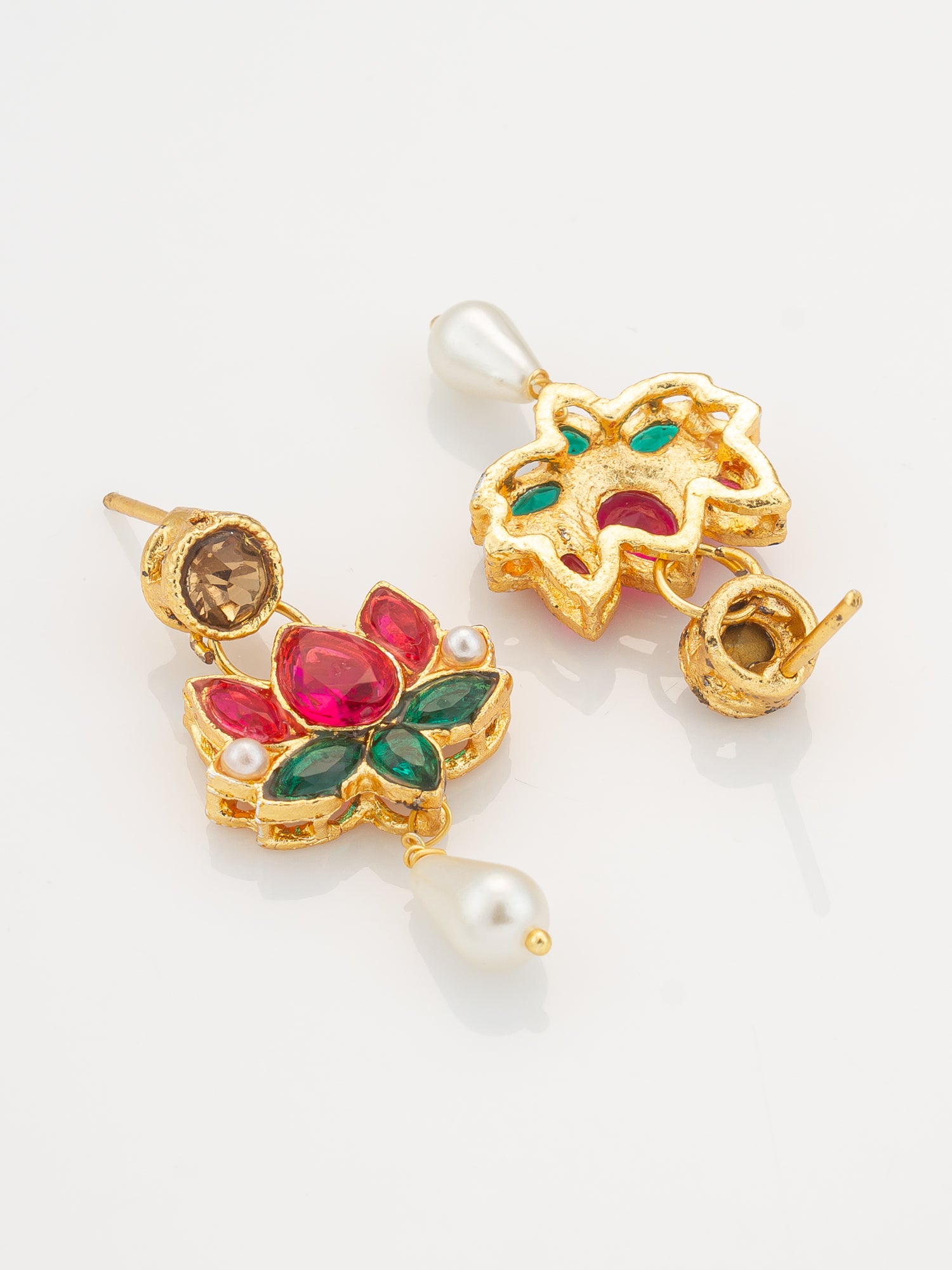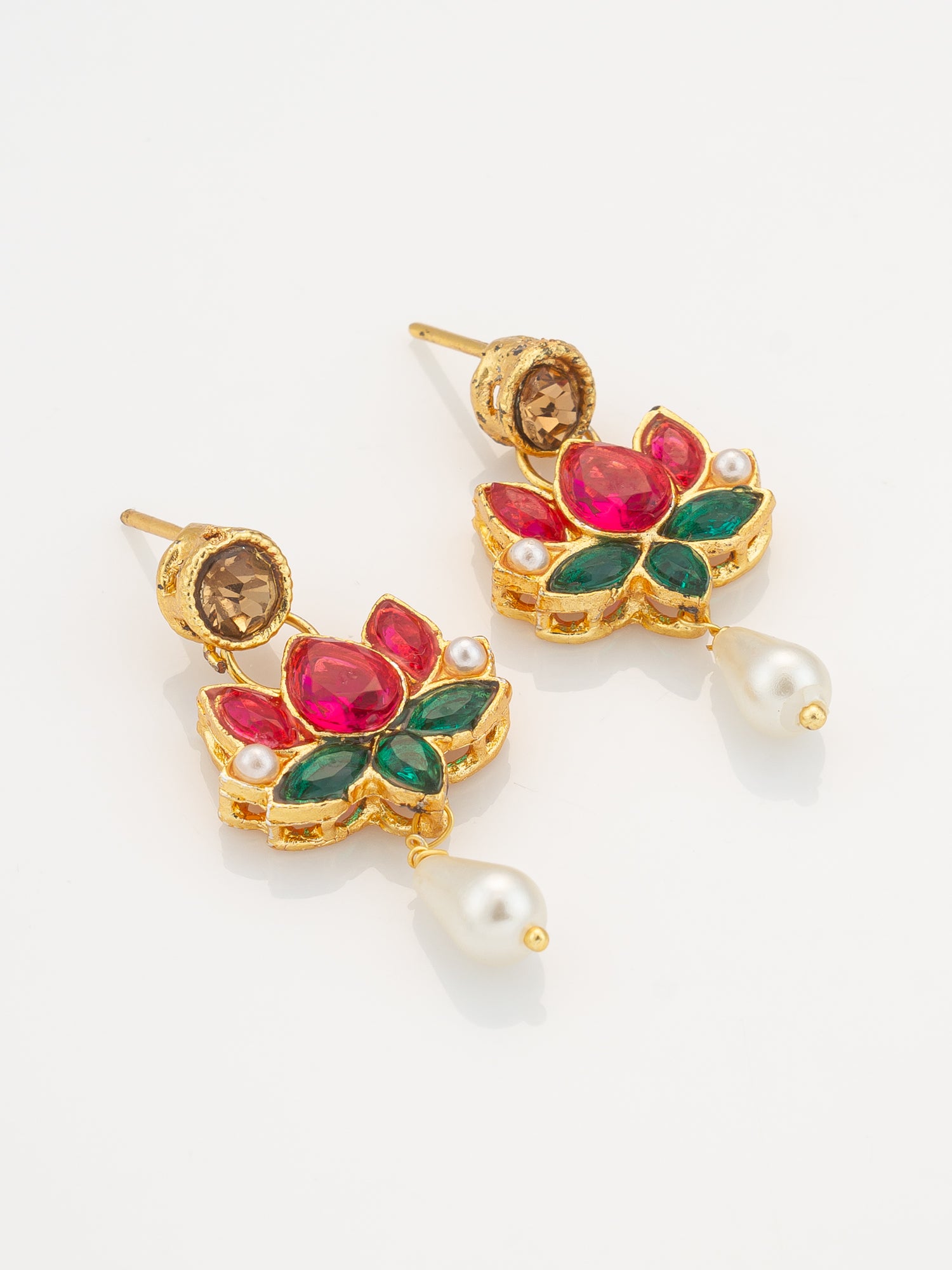 Elevate your ethnic ensemble with Aadita's stunning gold-plated choker necklace set. Adorned with red and green lotus motifs and pearl bead detailing, this piece captures traditional charm with modern flair. The handcrafted design paired with dangling pearl elements adds elegance to your neckline. Lightweight yet striking, it’s perfect for festive or wedding occasions. Pair it with your favourite saree or lehenga to complete the regal look.