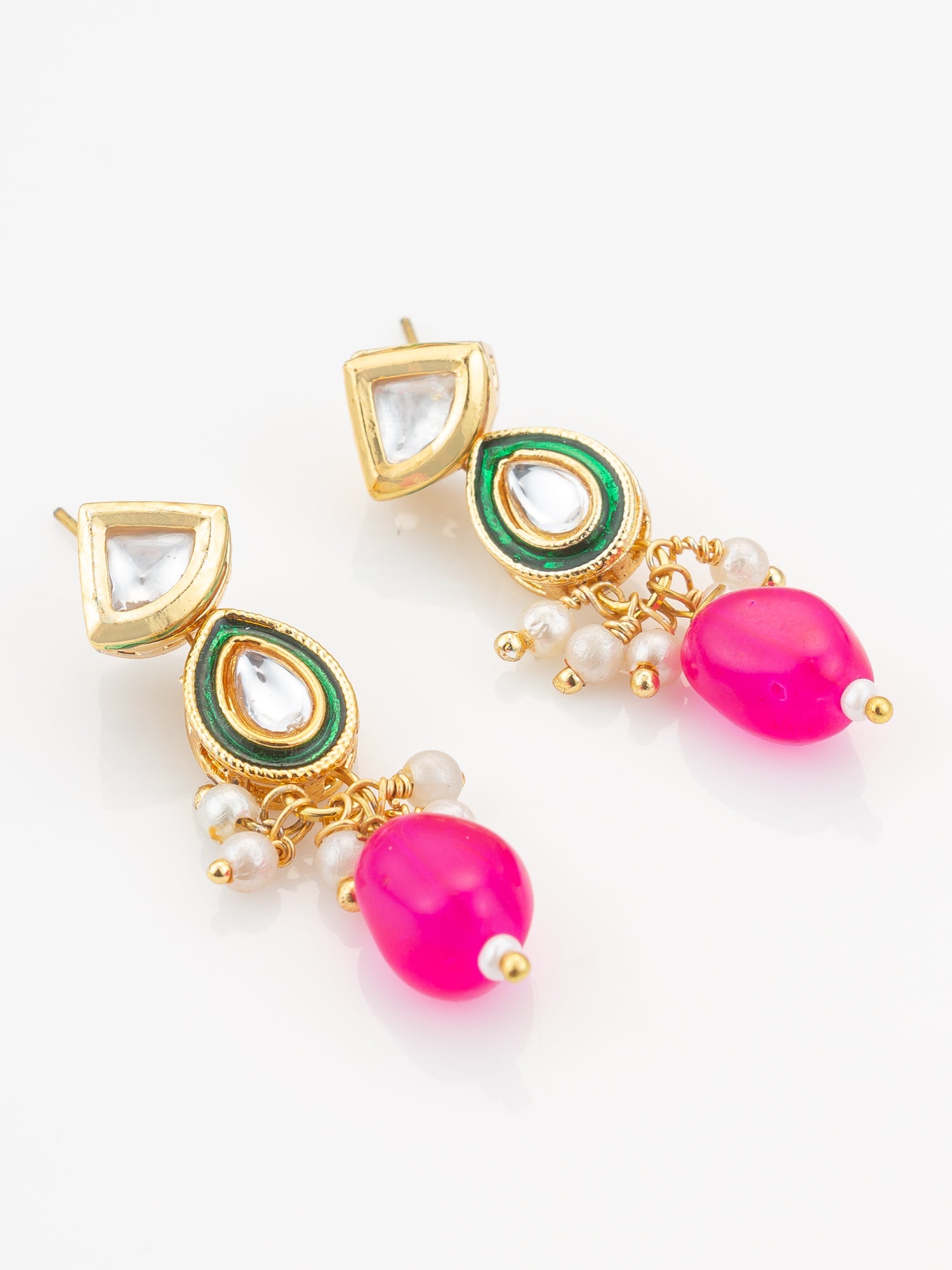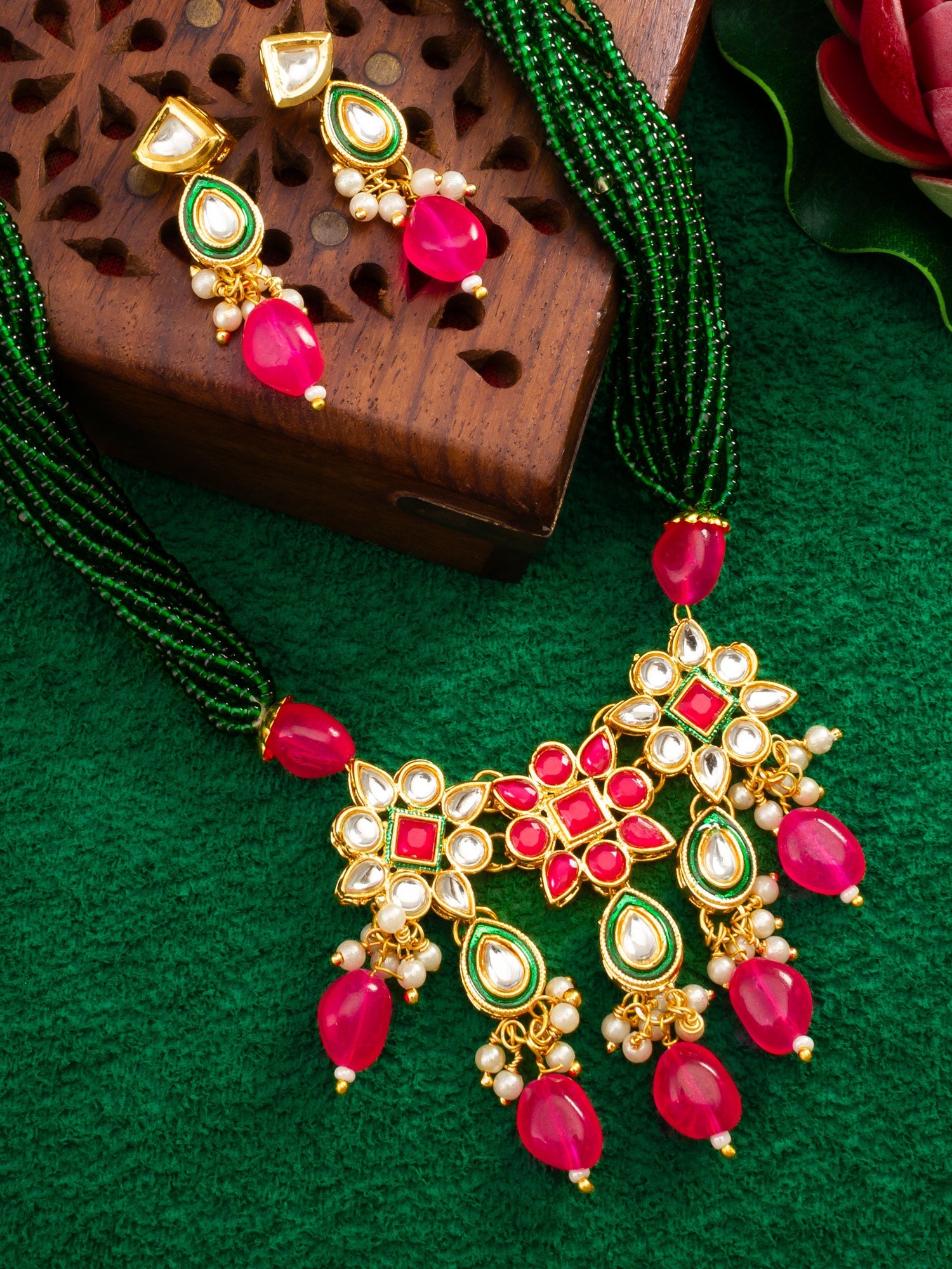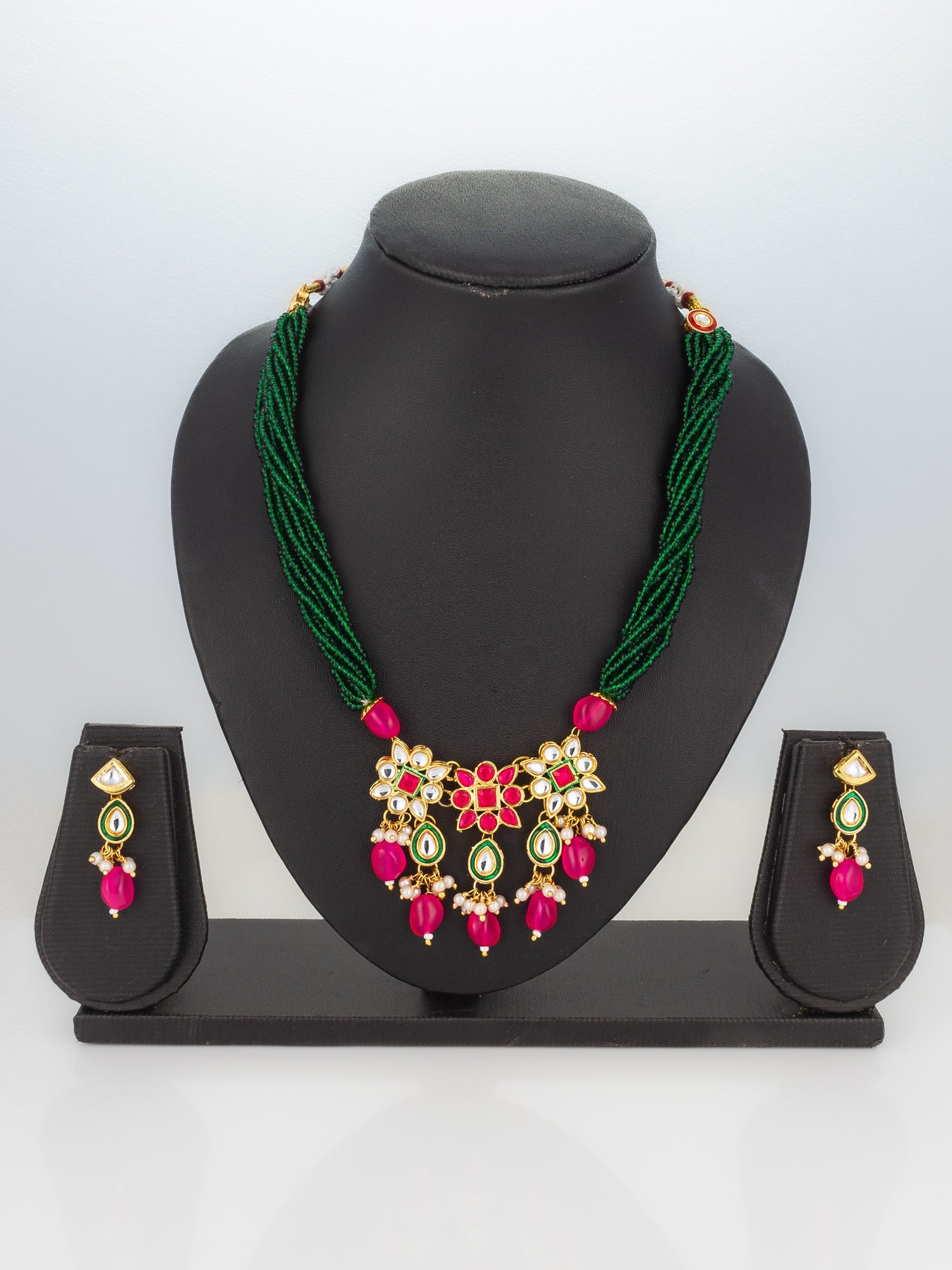 Elevate your traditional ensemble with Aadita's Gold Plated Pink & Green Beads Necklace Set. This exquisite set showcases vibrant green twisted beads paired with intricate pink and white stone work. The centerpiece features a floral design with detailed enamel, kundan stones, and pearl droplets that add a royal charm. Matching earrings complete the look, making it perfect for weddings and festive occasions.