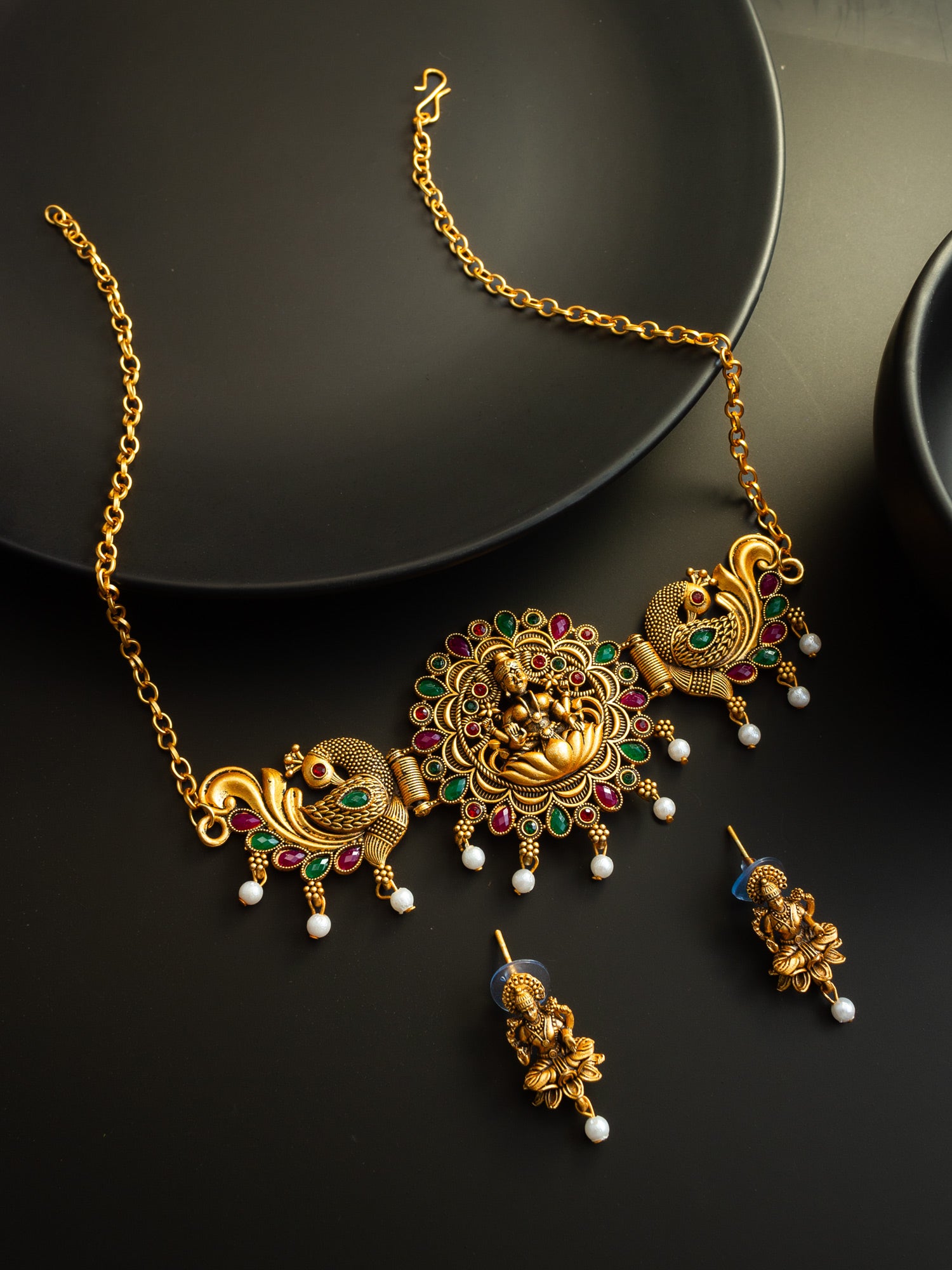 Elevate your ethnic elegance with this intricately crafted Aadita gold plated choker necklace set featuring temple-style motifs and elegant peacock detailing. Embellished with red and green stones and delicate pearl hangings, this piece captures timeless South Indian tradition. Paired with matching Lakshmi earrings, this set is perfect for festive and wedding occasions. Add a divine charm to your traditional wardrobe with this spiritual design.