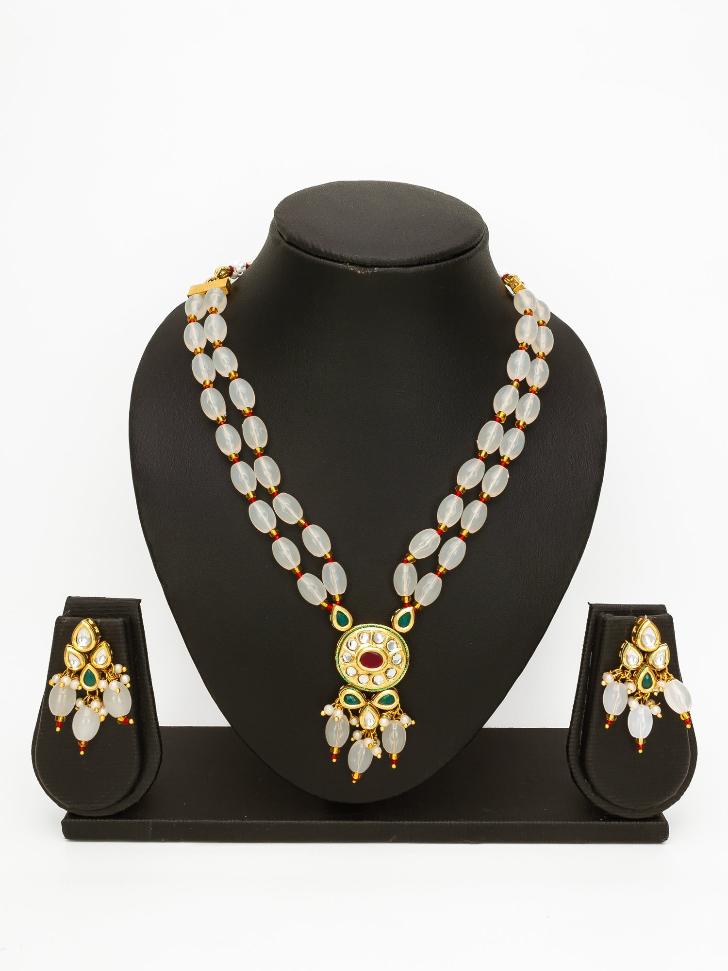 Elevate your ethnic look with this Aadita gold plated necklace set, featuring classic white beads paired with a striking kundan-studded pendant. The intricate design is adorned with sparkling stones and smooth bead accents, creating a graceful and royal appeal. Perfect for weddings, festivals, and traditional functions, this set brings a timeless charm to your outfit.