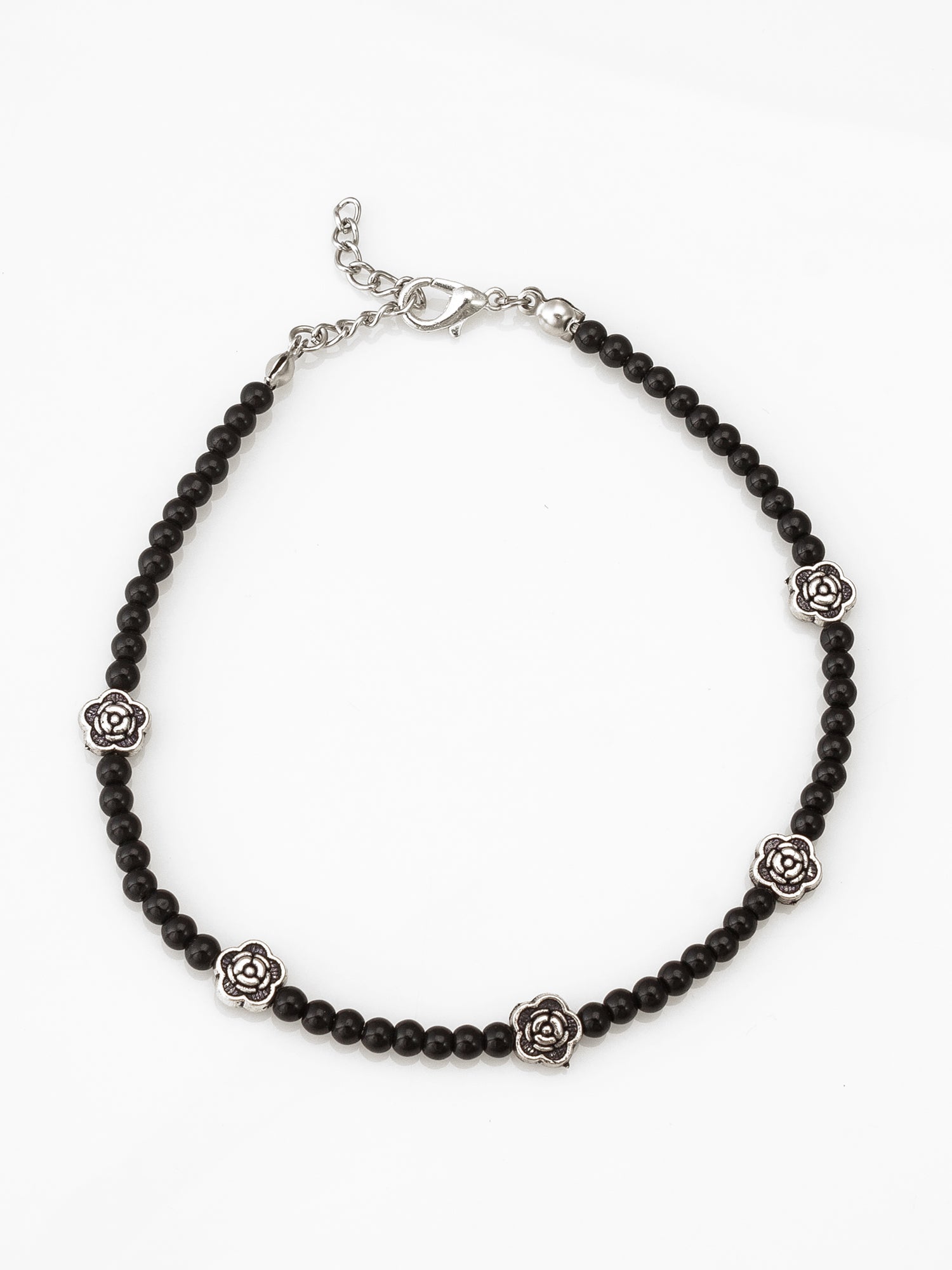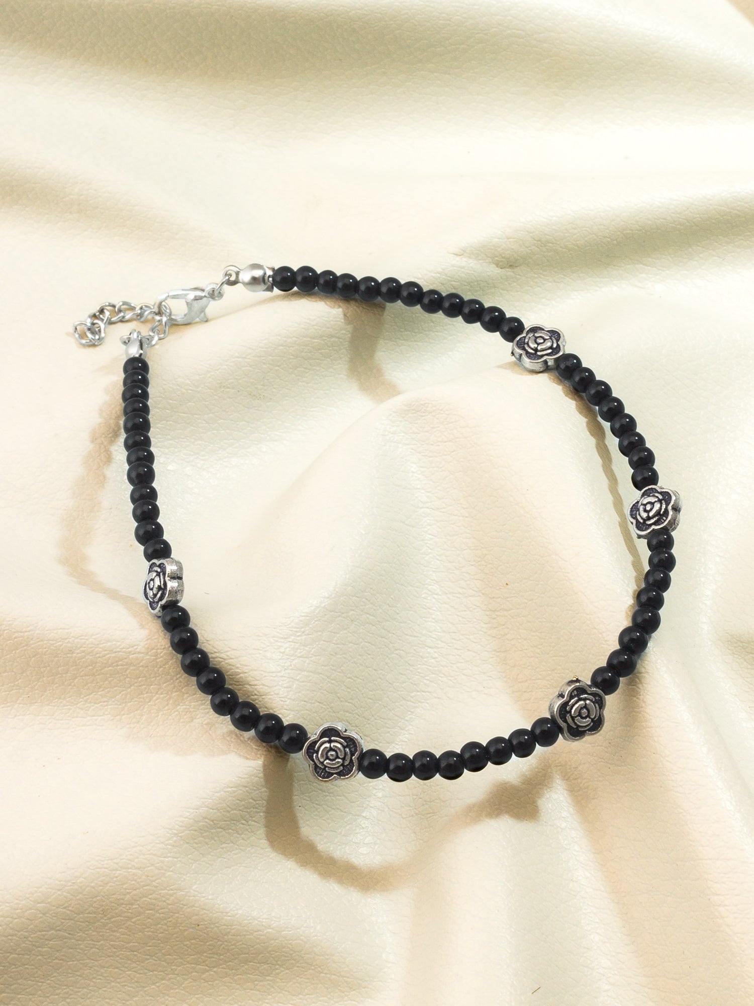 Radiate traditional beauty with this premium single anklet designed by Aadita. Showcasing beautifully crafted oxidized silver floral charms along a smooth black beaded chain, this accessory provides a touch of understated elegance. It is an exceptional addition for those who appreciate fine detailing and classic ethnic jewelry aesthetics.