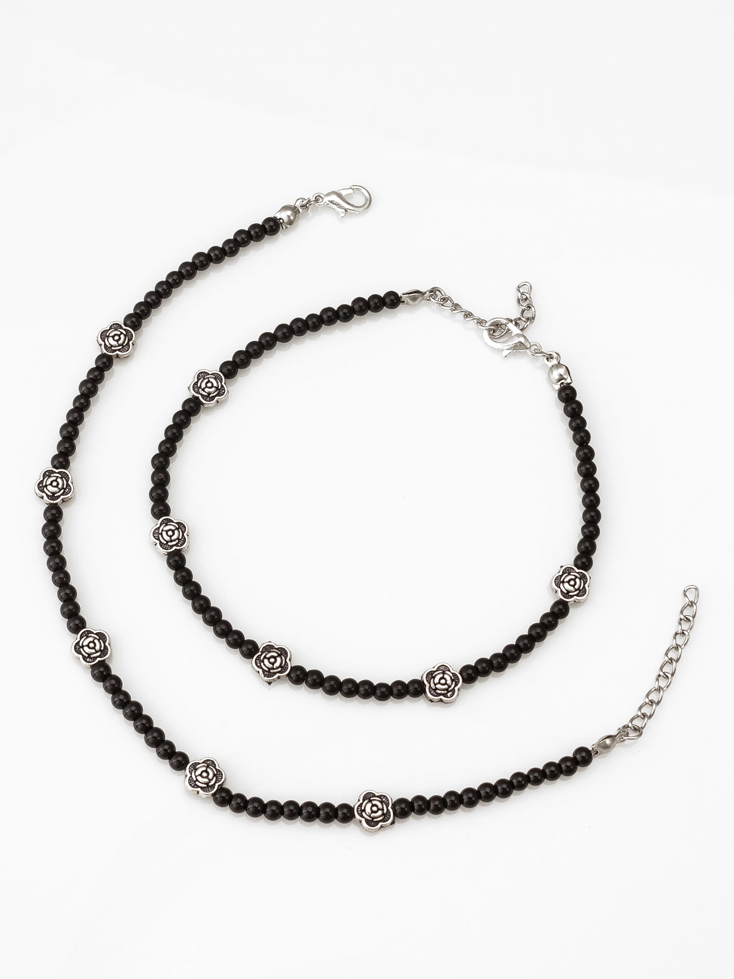 Enhance your footwear style with these exquisite floral anklets brought to you by Aadita. Adorned with oxidized silver rose motifs evenly spaced along a strand of classic black beads, this design exudes timeless sophistication. Ideal for women seeking a premium, traditional accessory that commands attention without overpowering the ensemble.