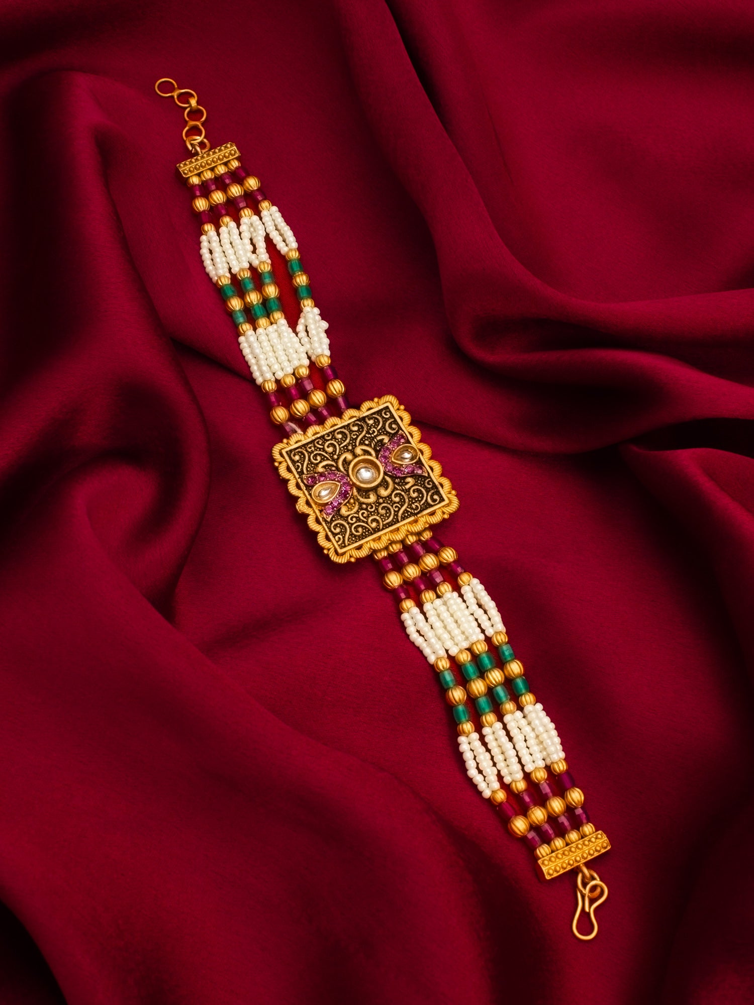 A masterpiece of traditional craftsmanship, this bracelet centers on a square plaque featuring ornate gold filigree work and central kundan embellishments. The sophisticated design transitions into multiple strands of high-quality white pearls, punctuated by emerald green and ruby red beads for a classic color palette. Designed for the modern woman who appreciates heritage style, it features an adjustable S-hook closure for a perfect wrist fit.