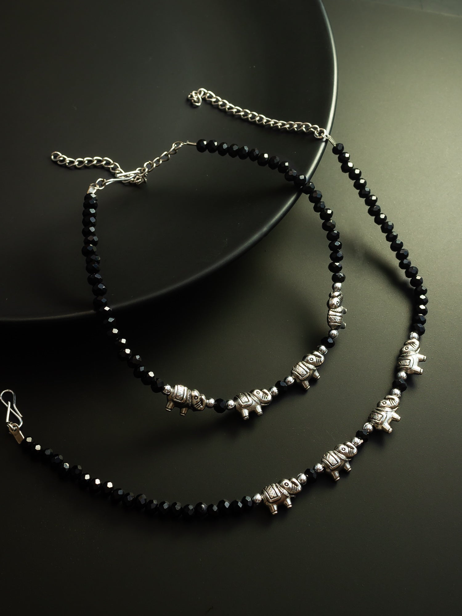 Elevate your ethnic look with Aadita's Silver Plated Black Beaded Elephant Design Anklet Set. These charming anklets feature finely crafted elephant motifs paired with glossy black beads for a bold, cultural accent. Designed for comfort and style, they add an enchanting touch to festive and traditional outfits. Perfect for daily wear or special occasions, this set is a must-have in your jewelry collection.