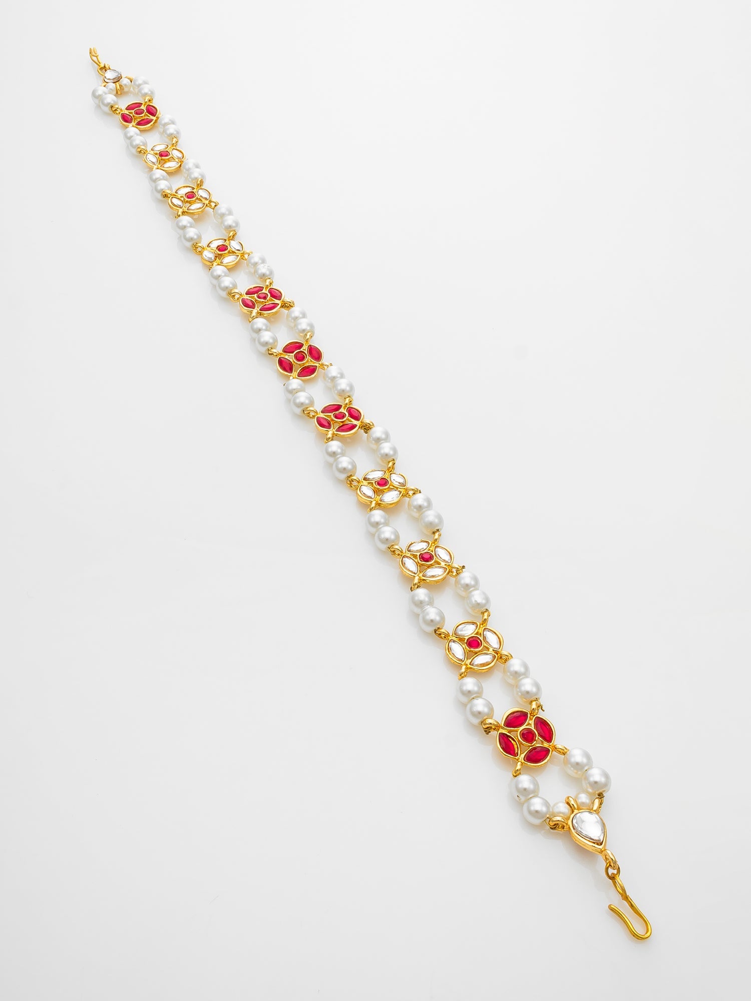 Enhance your ethnic charm with Aadita's Traditional Kundan Matha Patti. This headpiece features red enamel floral motifs intricately set with kundan stones and pearls. Its elegant structure beautifully frames the forehead, adding grace to bridal and festive looks. Crafted with a dual string of pearls and rich gold finish, this piece blends heritage with elegance.