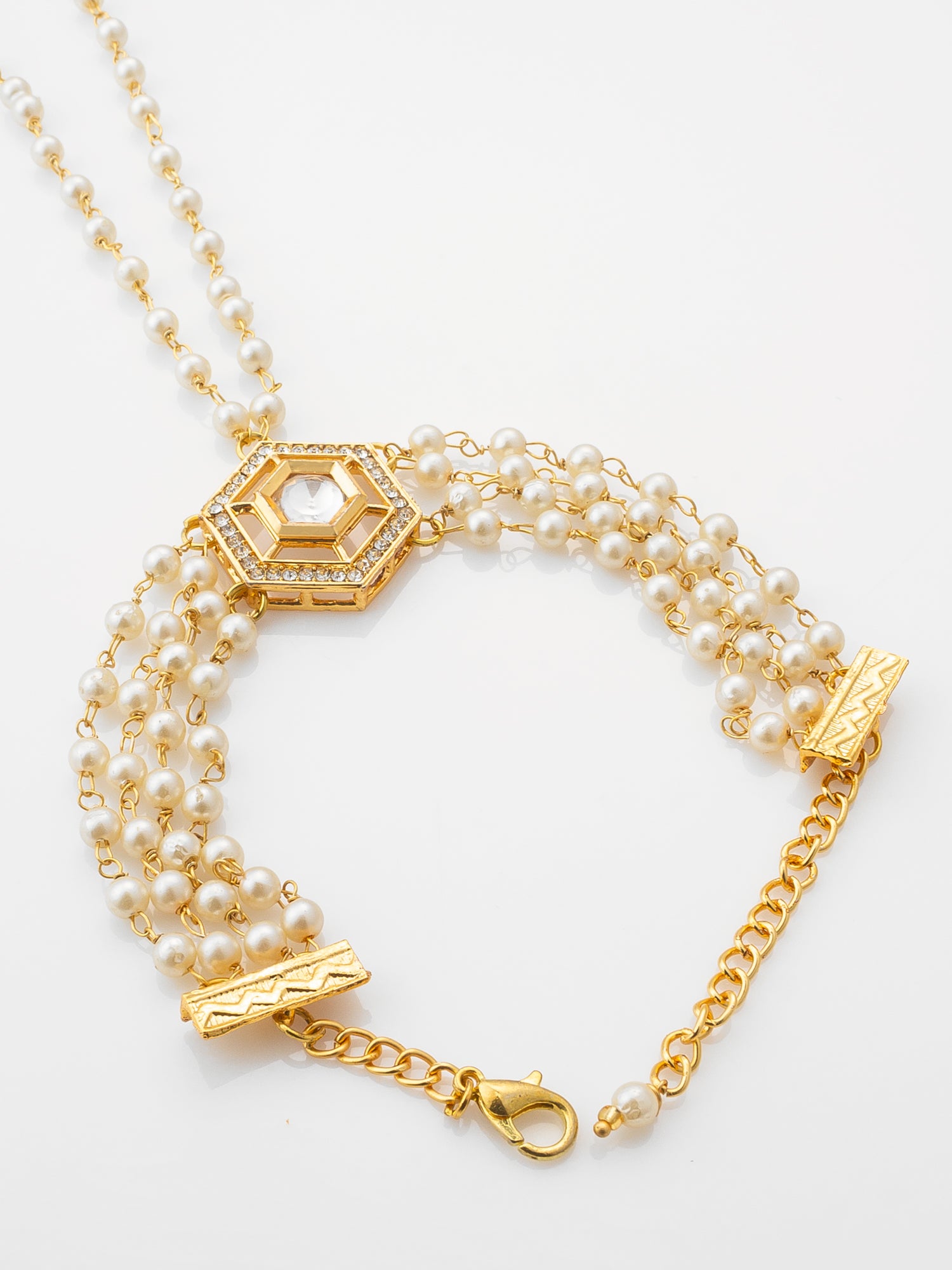 Add a regal touch to your ethnic look with this beautifully crafted Gold Plated Pearl Haathphool Bracelet. Designed with multiple strands of shimmering faux pearls and a central hexagonal Kundan-studded motif, this piece perfectly blends traditional aesthetics with modern elegance. The extended finger chain design enhances the appeal, making it ideal for festive occasions, weddings, and cultural celebrations. Whether you're styling it with a saree, lehenga, or Indo-western outfit, this hand harness bracelet ensures you stand out with grace and charm.