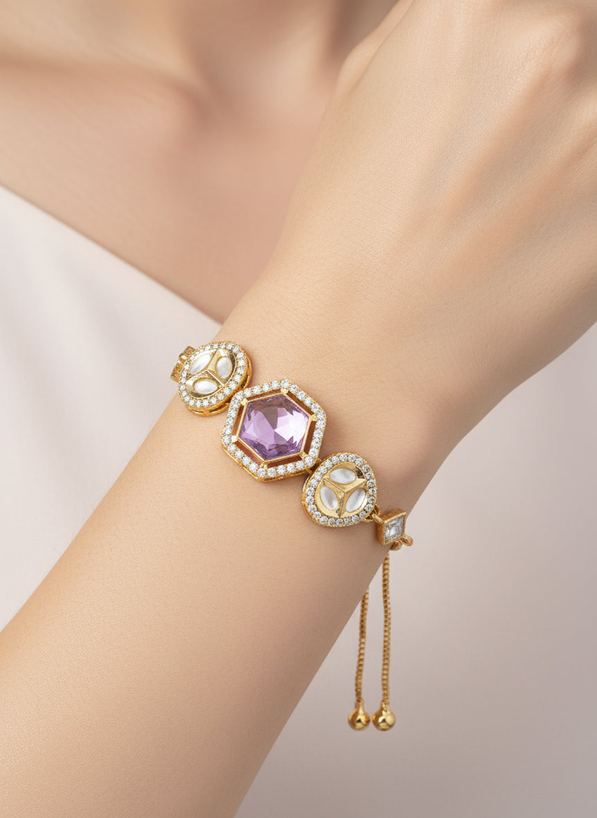 This premium adjustable bracelet features a central lavender-toned hexagonal stone, meticulously framed by a halo of shimmering accents. Flanked by traditional circular kundan-style settings and geometric square stones, the design merges contemporary geometric shapes with classic Indian artistry. The gold-plated finish and delicate chain drawstring ensure a sophisticated fit for festive occasions and elegant evening wear.