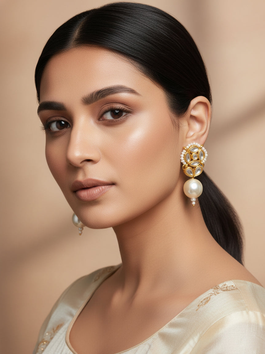 Aadita’s white kundan pearl drop earrings are designed for understated traditional styling. The compact circular top with white stones is complemented by a single pearl drop, creating a clean and elegant finish. Ideal for daytime functions, pooja wear, and minimal ethnic looks.
