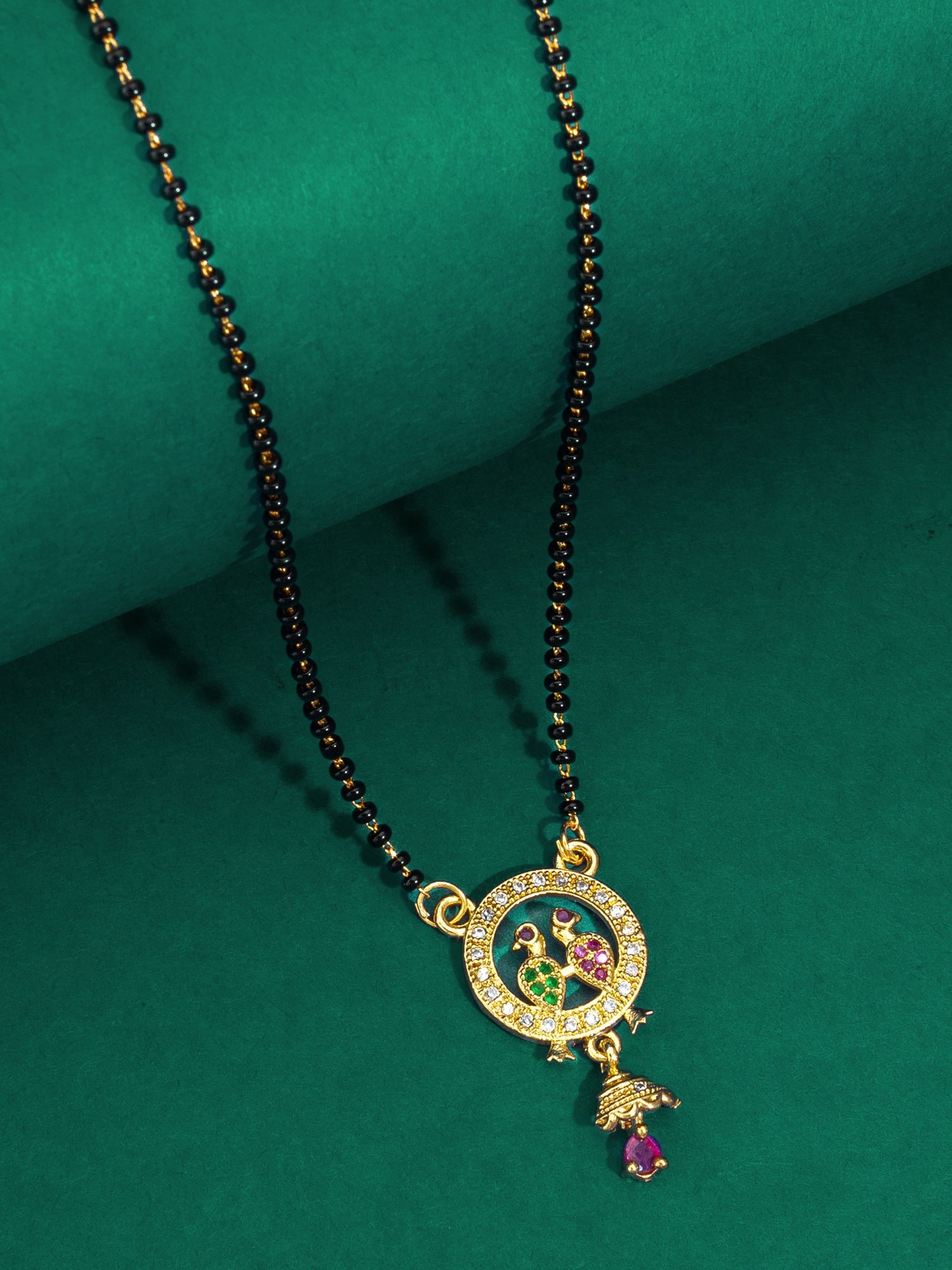 Celebrate timeless tradition with this Aadita Mangalsutra, featuring a classic circular pendant. Inside the halo of white stones sit two beautifully detailed birds adorned with green and pink stones. A petite Jhumka-style charm hangs from the bottom, finished with a single pink teardrop stone, making this a perfect accessory for sarees and ethnic suits.