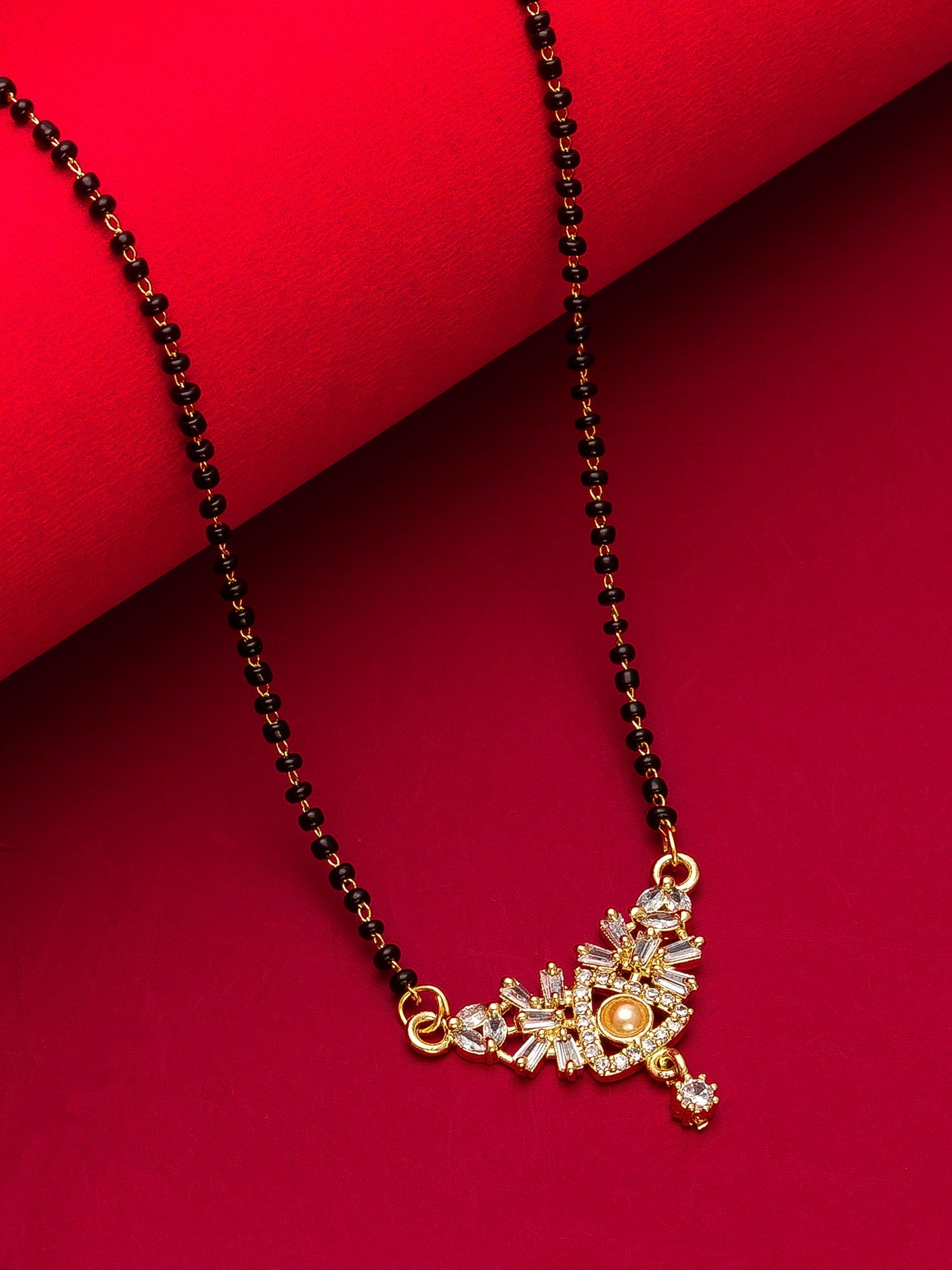Embrace a fusion of contemporary geometry and timeless tradition with this striking triangular pendant. The design showcases a bold arrangement of baguette-cut stones fanning out from a delicate pearl center, creating a unique visual texture. Perfect for those seeking a departure from standard curves, this Aadita masterpiece adds a sharp, premium aesthetic to your jewelry collection, promising to be a conversation starter.