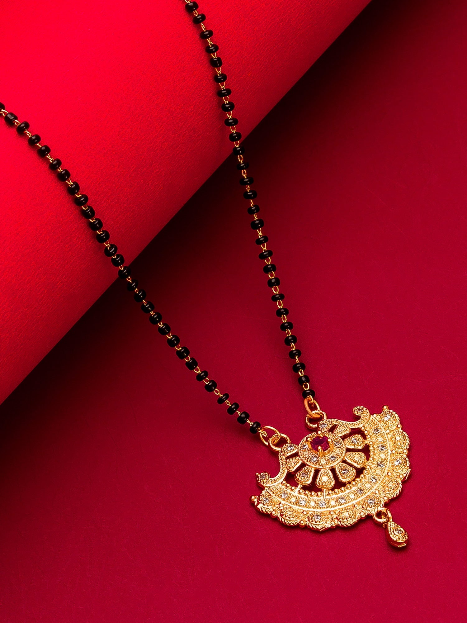 Step into the spotlight with this majestic Aadita mangalsutra, inspired by classic Chandbali designs. The pendant is a masterpiece of ornate gold-tone detailing, featuring a central red stone surrounded by concentric circles of sparkling crystals. Its grandeur and premium finish make it an essential piece for those who cherish high-quality, traditional Indian jewelry.