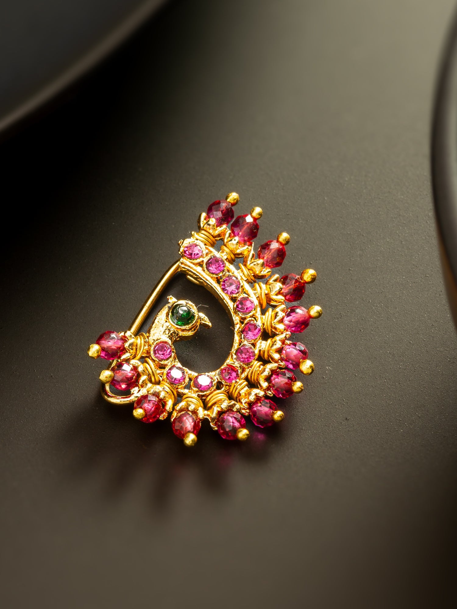 This Aadita nath features a bold circular form adorned with ruby-toned stones and a contrasting green accent at the center. The structured gold-plated base adds durability while maintaining a premium traditional finish. Ideal for festive and wedding looks, it offers strong visual impact without excess weight. Designed for those who prefer rich color-driven jewelry.