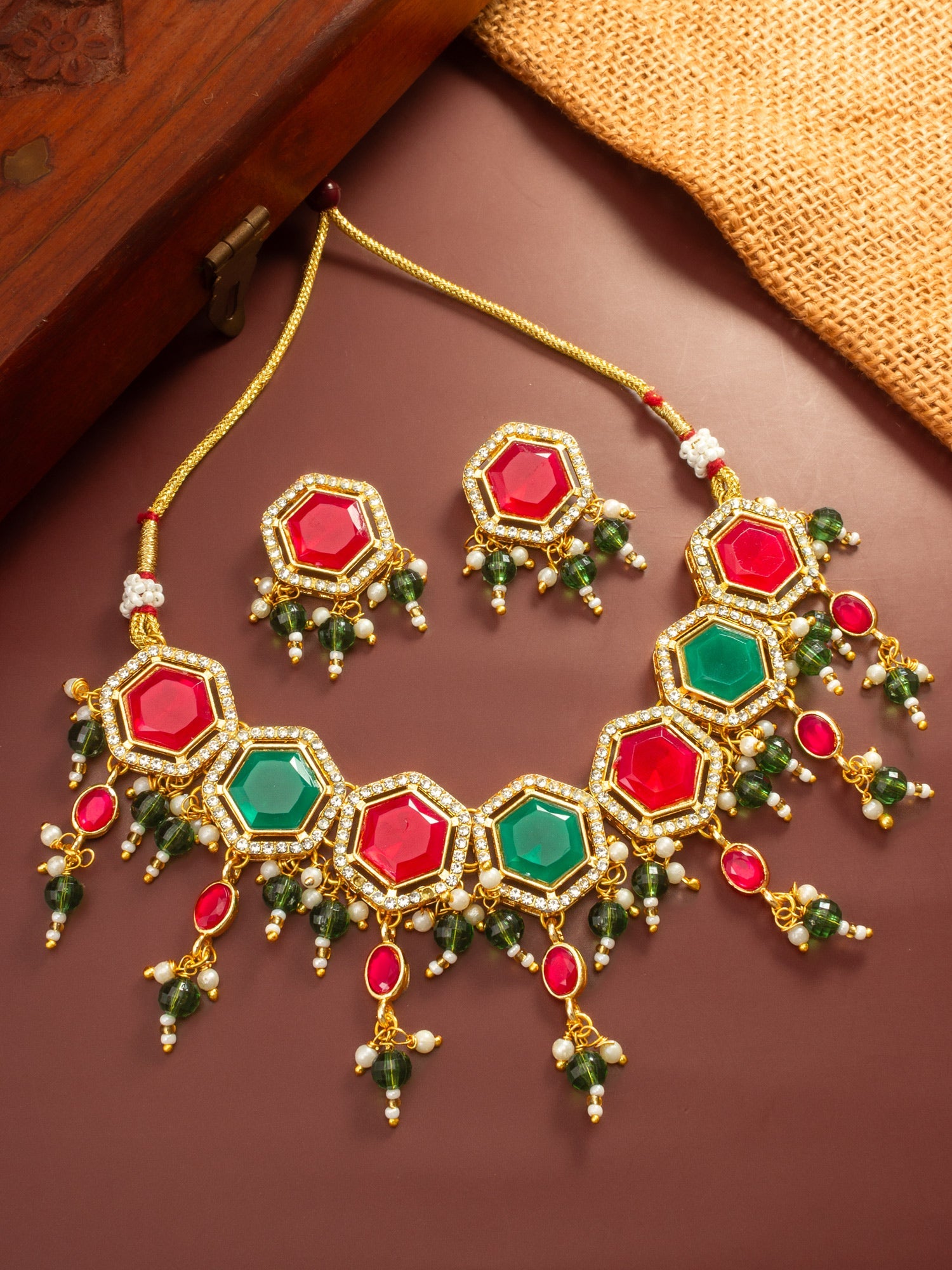 Embodying traditional craftsmanship, this choker set showcases a vibrant alternating pattern of ruby red and emerald green hexagonal stones. The gold-plated alloy base is meticulously detailed with white stone borders and hanging green bead clusters. The necklace features a sturdy adjustable dori closure for comfort and versatility, making it a perfect sales-focused choice for high-end ethnic wardrobes.